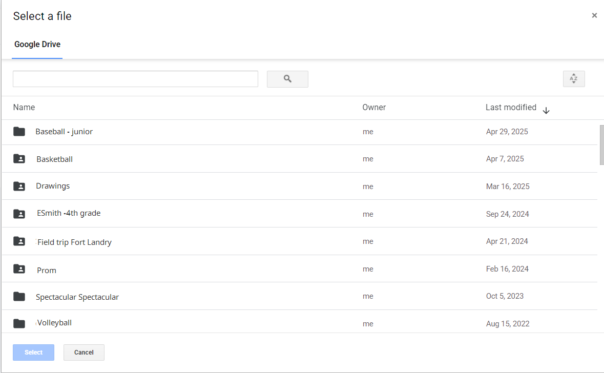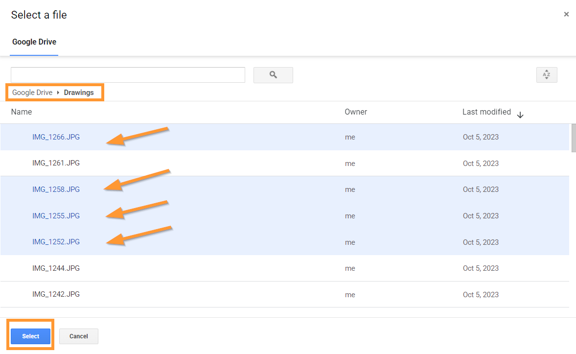 • Select one or more image within a folder. Click select to start the upload. After uploading, reopen the drive to add more images in a different folder, click on the links at the top of the page.  (Note: image previews are not available in Google drive.)