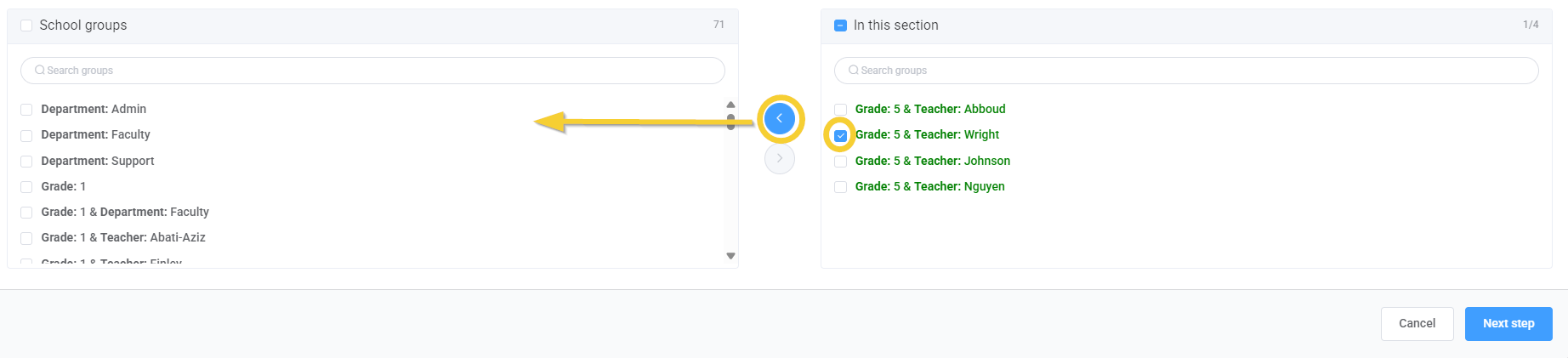 | Checkmark the selected group(s), then use the arrow to move them to the right-side column. Click Next step when done. | ![]() ![]() |