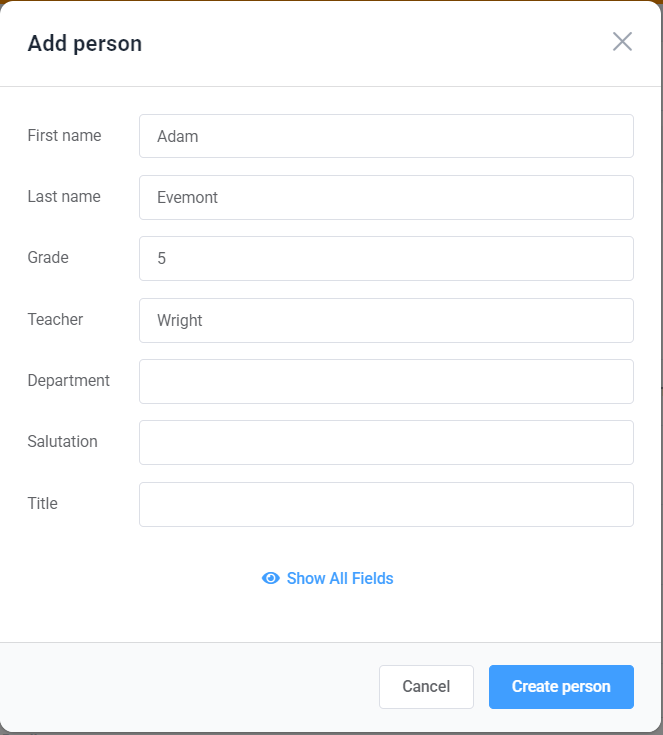A form will appear where you can add the person's name, grade, and other info. If needed, click on Show All Fields to access additional information areas.
