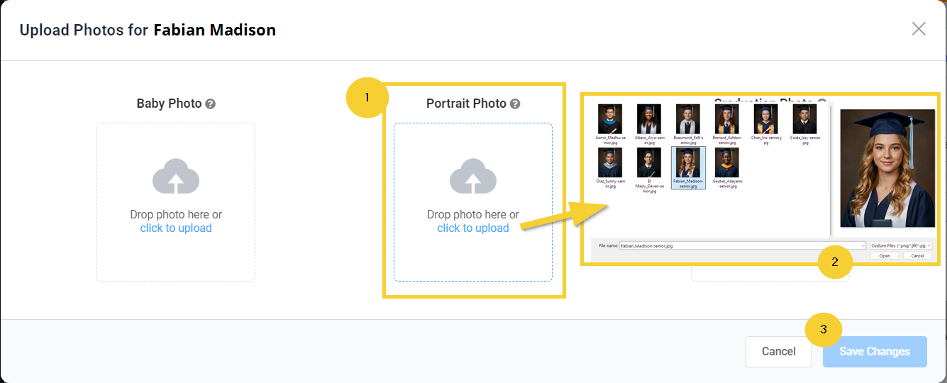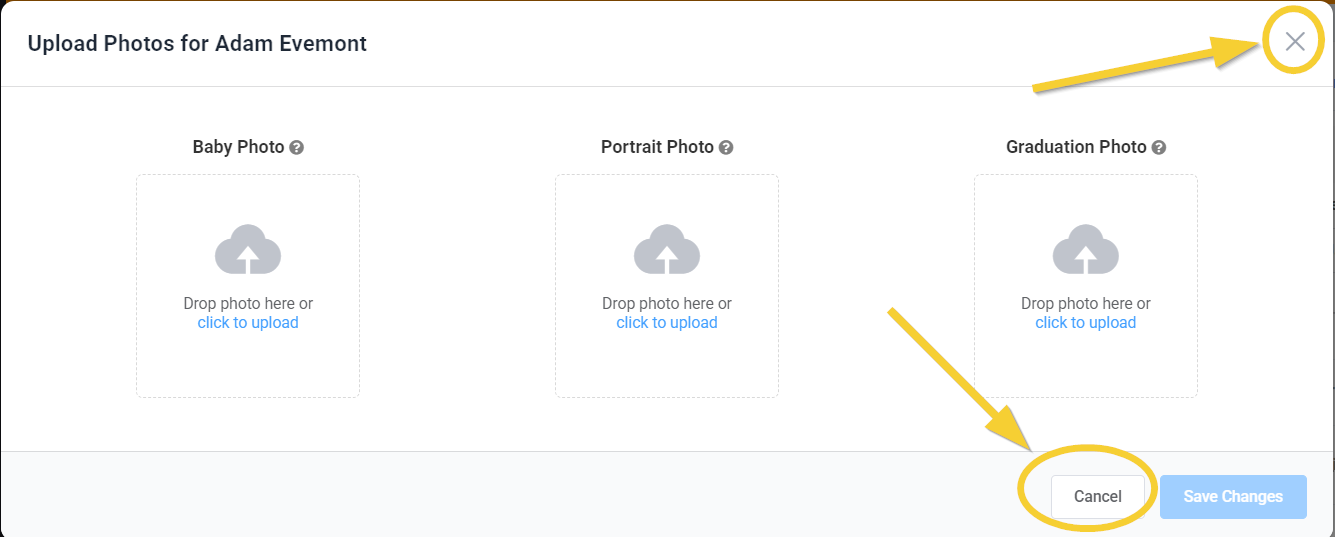 To add a portrait photo, click on the portrait photo upload link or drag and drop an image into this area. Save change to apply the image to the person's record.