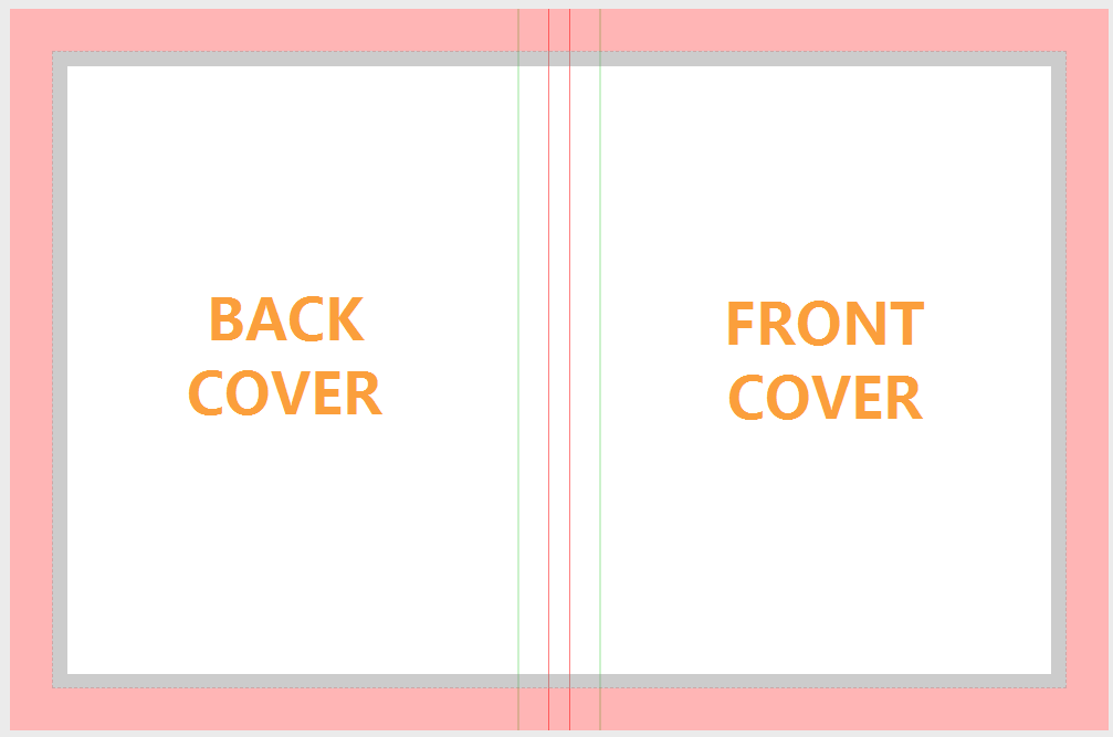 | The spine is located in the middle of the page. The red lines indicate where the spine folds over and the green lines indicate safe margins. Do not place text or featured images over the spine lines. Background texture/color should go smoothly over the entire spine area. More information on background application over the spine is below. Hard cover and Soft cover-Perfect Bound books may have spine text added if they are over 72 pages. This creates a sufficiently wide spine area to place text. See below for more info about spine text placement. Saddle Stitch covers may never have spine text, since it is a single fold with two staples in it. | ![]() |